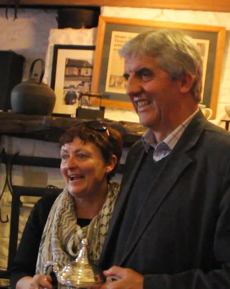 “Sunday Morning in the Thatch” is an informal, relaxed session of music, recitations, and poetry. Everyone is invited to come along and join in with recitations. The PJ Drummond Cup – in memory of a man who was a great aficionado of William Allingham’s poetry – is presented by his family for the best recitation of the morning. The winner is chosen by a tongue-in-cheek popular vote, using brown envelopes as ballots. Attendees can vote for their favourite recitations by enclosing some paper currency (€5 or more). The collected funds pay for the music and incidentals. The Drummond Cup is a light-hearted competition, and the laissez-faire attitude enhances the fun aspect of the morning.