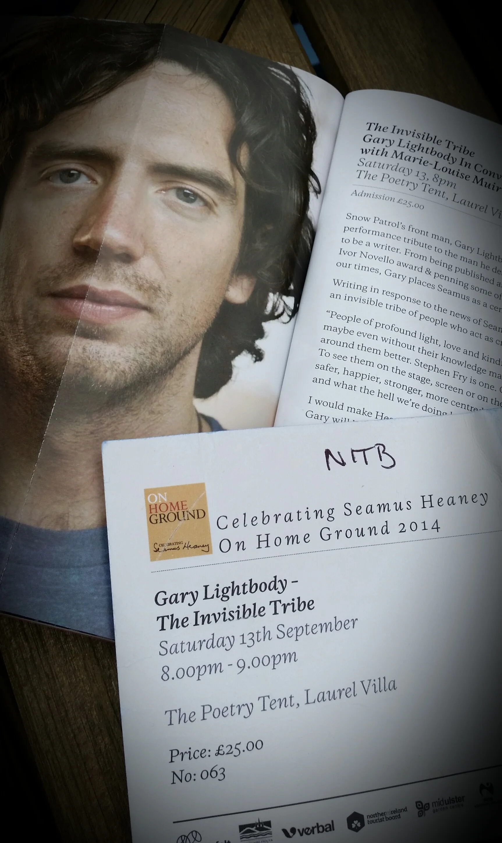 Snow Patrol's front man, Gary Lightbody, paid his first public performance tribute to the man he described as making him want to be a writer. From being published as a poet at 15 to winning an Ivor Novello award & penning some of the biggest anthemic hits of our times, Gary places Seamus as a central force in his creative life. Writing in response to the news of Seamus' death, he wrote about an invisible tribe of people who act as creative touchstones. "People of profound light, love and kindness that simply maybe even without their knowledge make us and the world around them better. Stepehen Fry is one. Guy Garvey another. To seem them on the stage, screen or on the page makes us feel safer, happier, stronger, more centred and less confused by life and what the hell we're doing here. I would make Heaney chieftain of that 'invisible tribe.'" Gary was in conversation with the On Home Ground curator Marie Louise Muir.